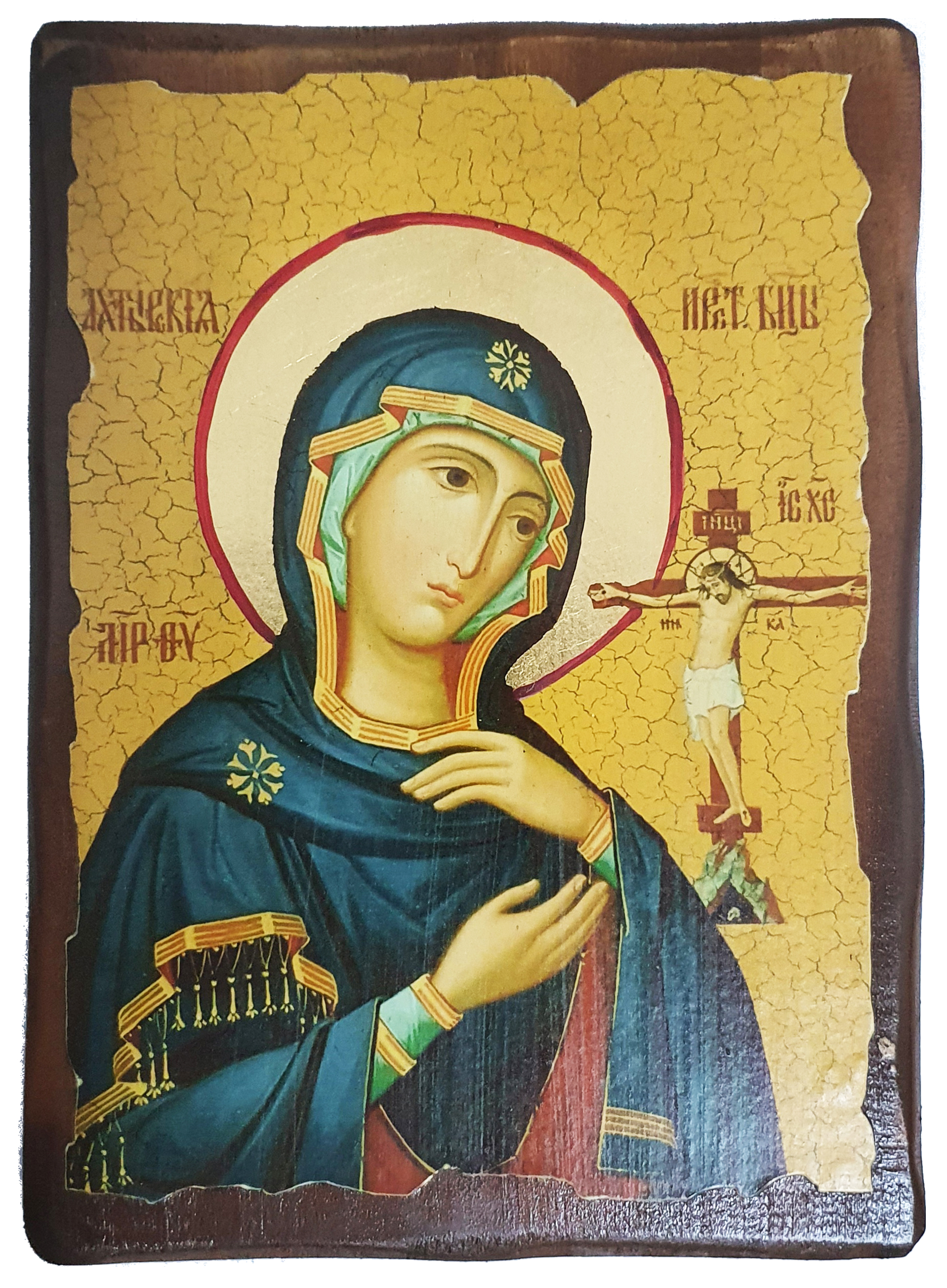 Икона ручной работы, искусственно сделанная под старину, материал: дерево, литография, краски, золочение, лаки. На оборотной стороне сургучная печать с символом Святой горы Афон. Упаковка конверт из мешковины.