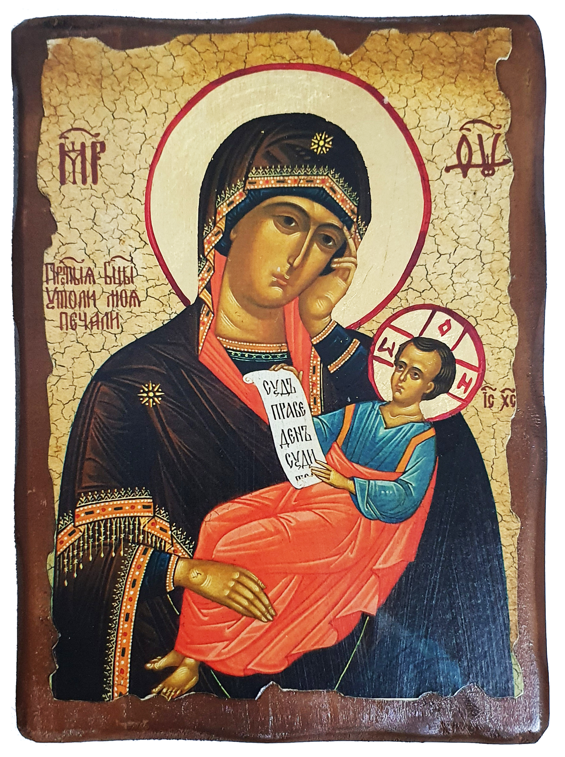 Икона ручной работы, искусственно сделанная под старину, материал: дерево, литография, краски, золочение, лаки. На оборотной стороне сургучная печать с символом Святой горы Афон. Упаковка конверт из мешковины.