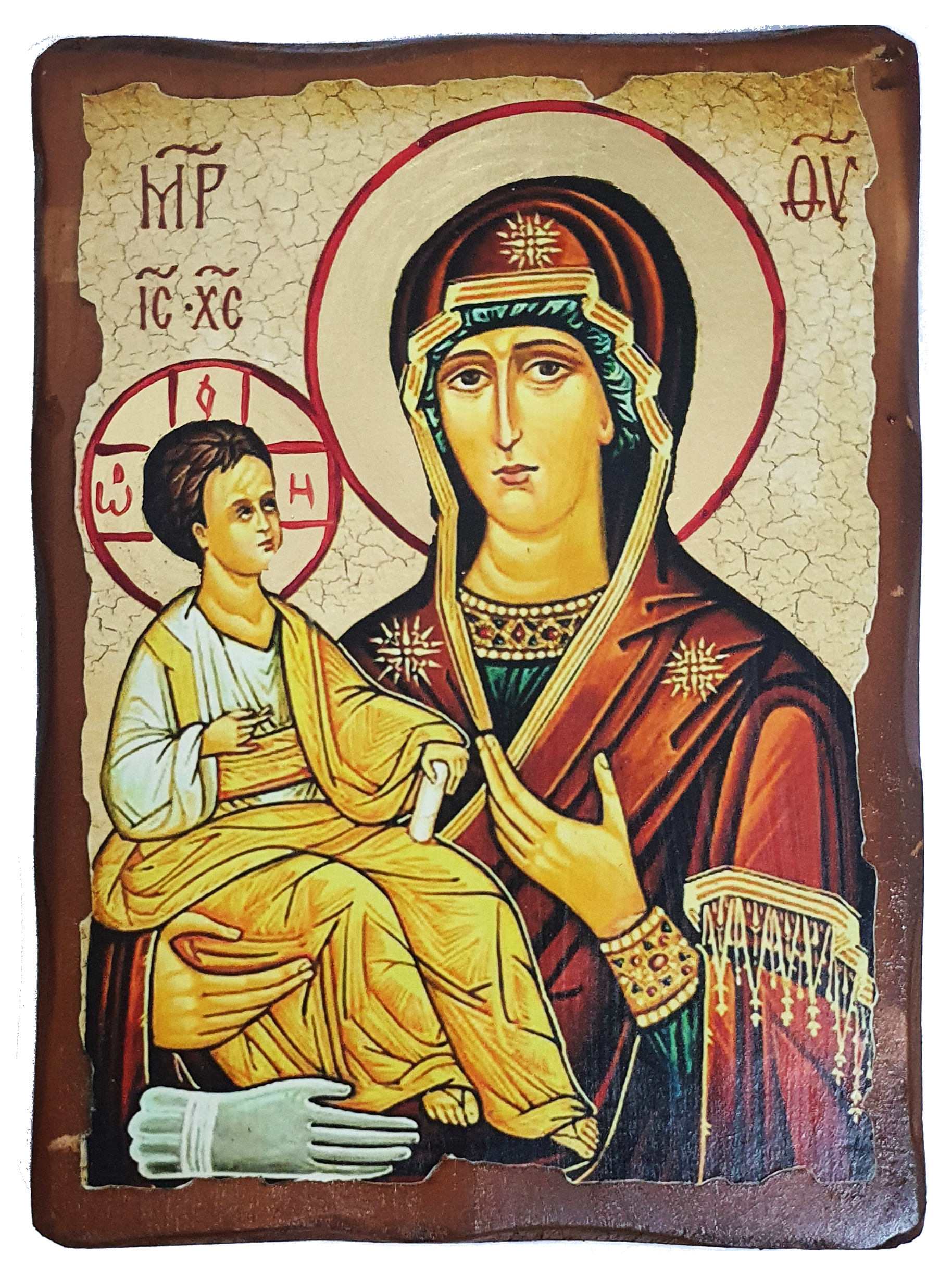 Икона ручной работы, искусственно сделанная под старину, материал: дерево, литография, краски, золочение, лаки. На оборотной стороне сургучная печать с символом Святой горы Афон. Упаковка конверт из мешковины.