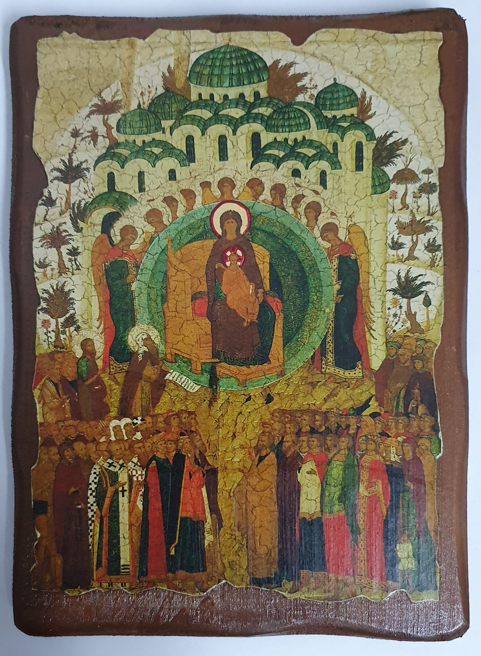 Икона ручной работы, искусственно сделанная под старину, материал: дерево, литография, краски, золочение, лаки. На оборотной стороне сургучная печать с символом Святой горы Афон. Упаковка конверт из мешковины.