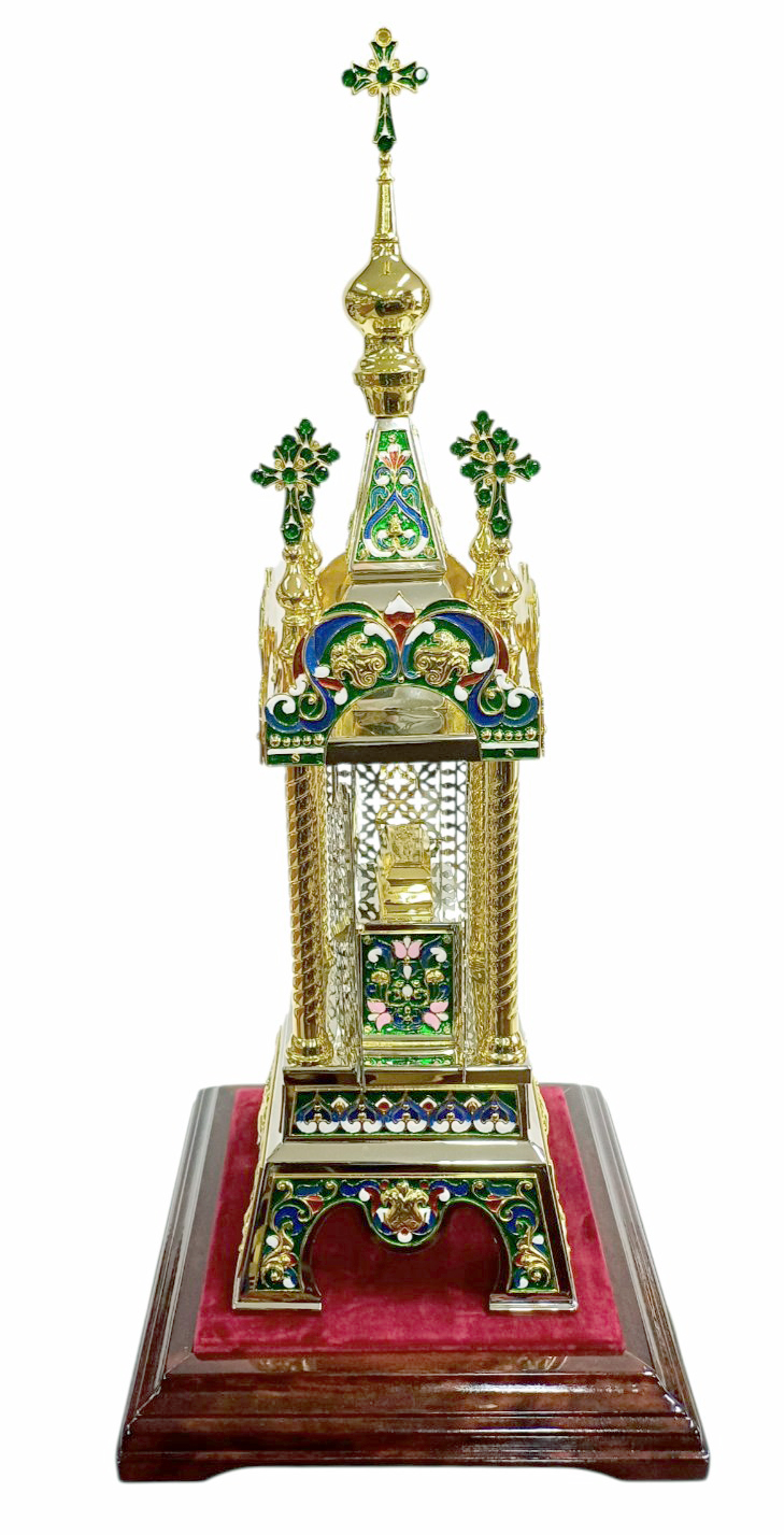 Эта изысканная дарохранительница выполнена в форме церкви с колоннами и открывающей дверцей. Ее дизайн украшен ювелирными вставками, расписанными горячими эмалями, а декоративные узоры выполнены с помощью лазерной резки. Благодаря никелевому и золотому покрытию изделие имеет богатый и элегантный вид.