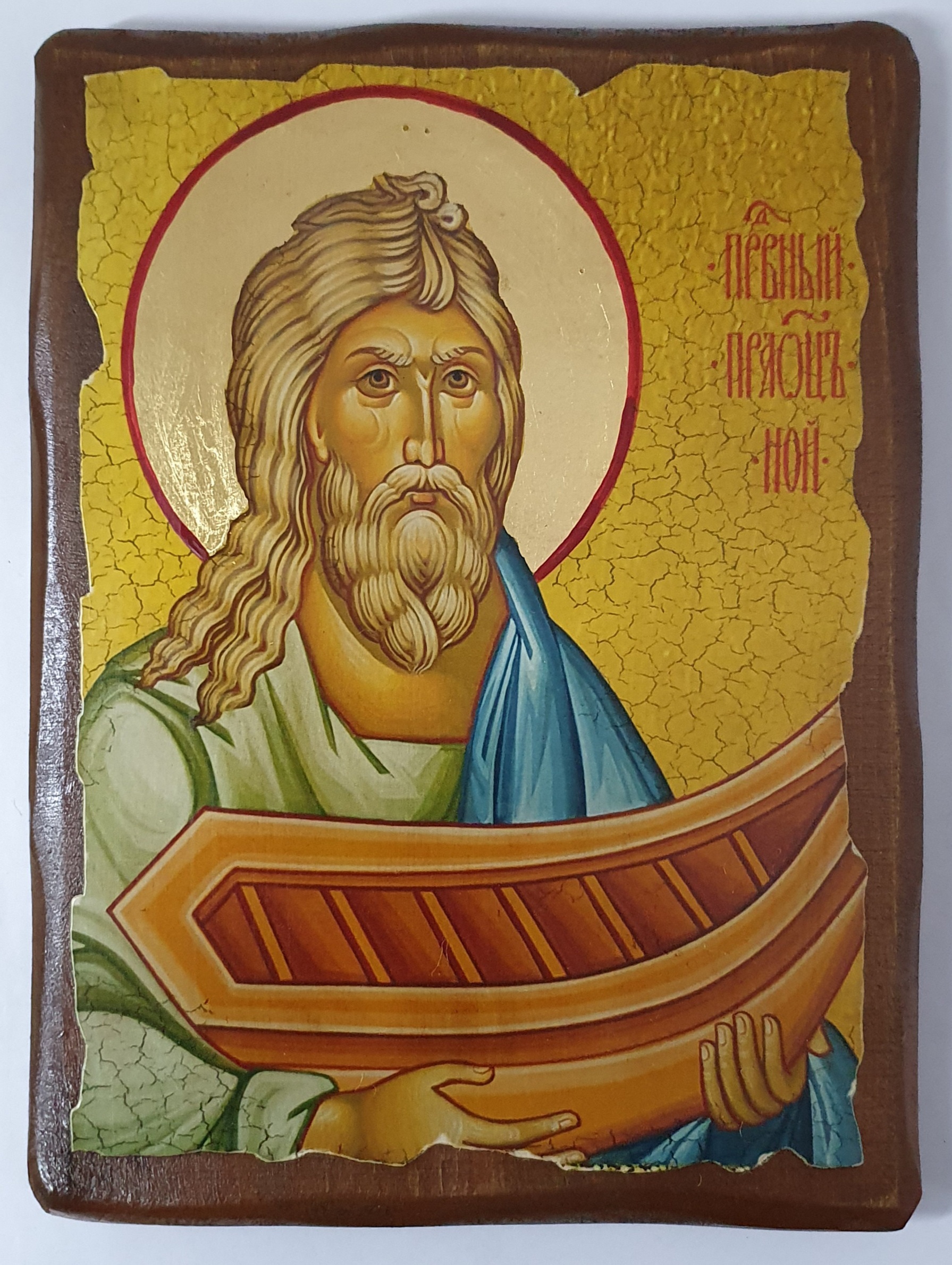 Икона ручной работы, искусственно сделанная под старину, материал: дерево, литография, краски, золочение, лаки. На оборотной стороне сургучная печать с символом Святой горы Афон. Упаковка конверт из мешковины.