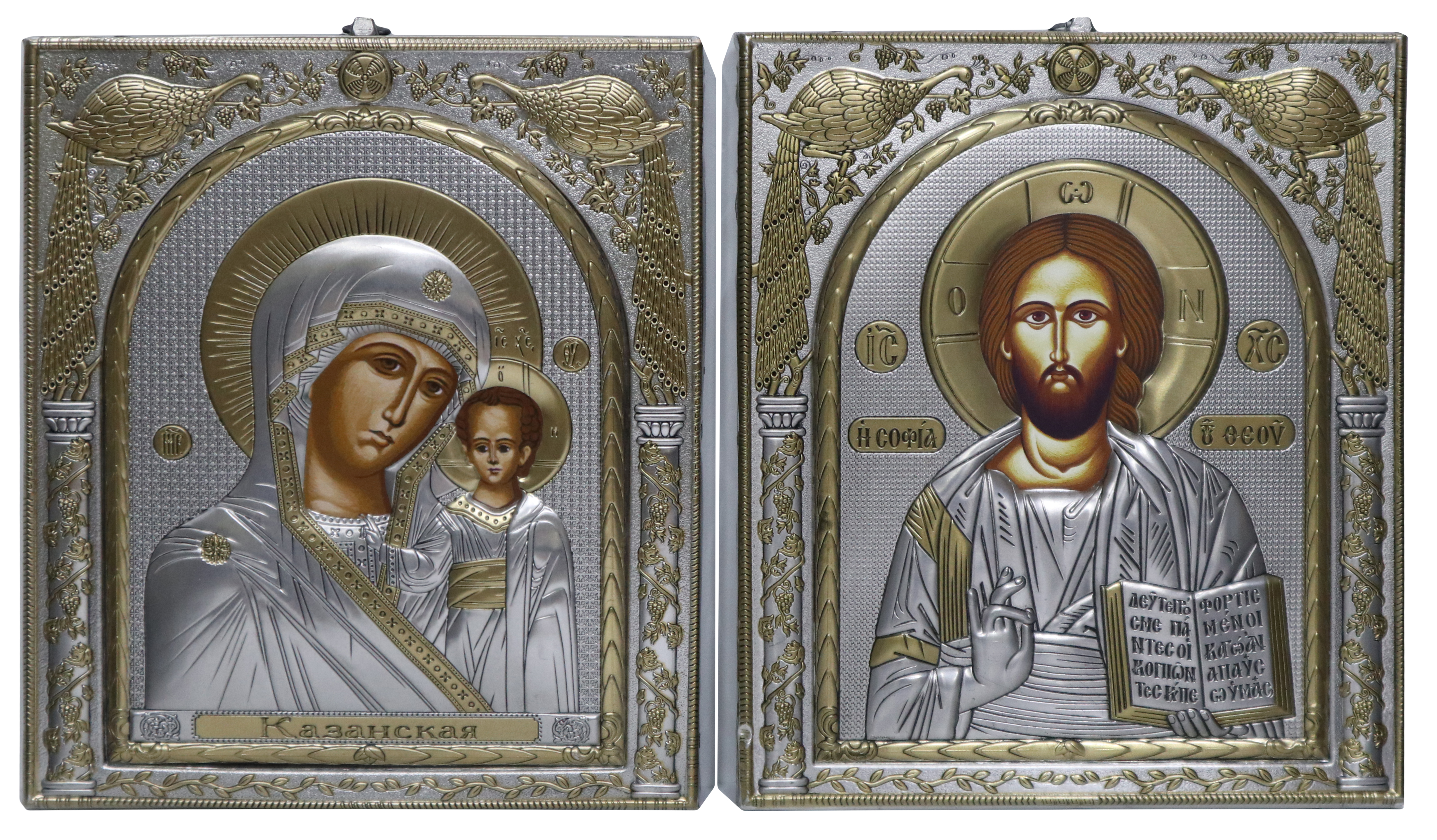 Пара Вседержитель Казанская ↕24,5см ↔20,5см Полиграфия PVD(серебрение) Кожа Греция