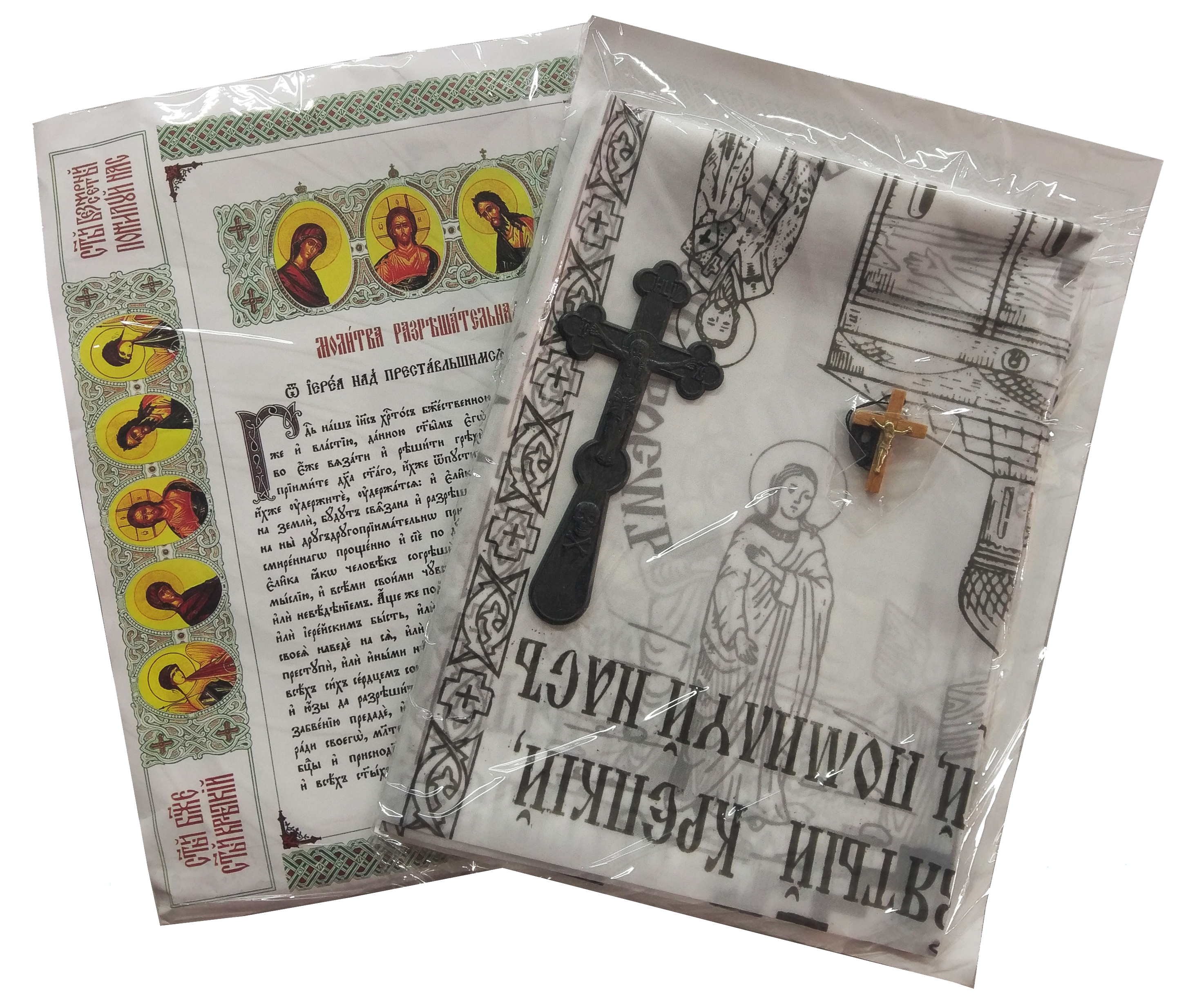 Состав: разрешительная молитва, покрывало шелк, крест в руки, крест нательный, свечи, икона.