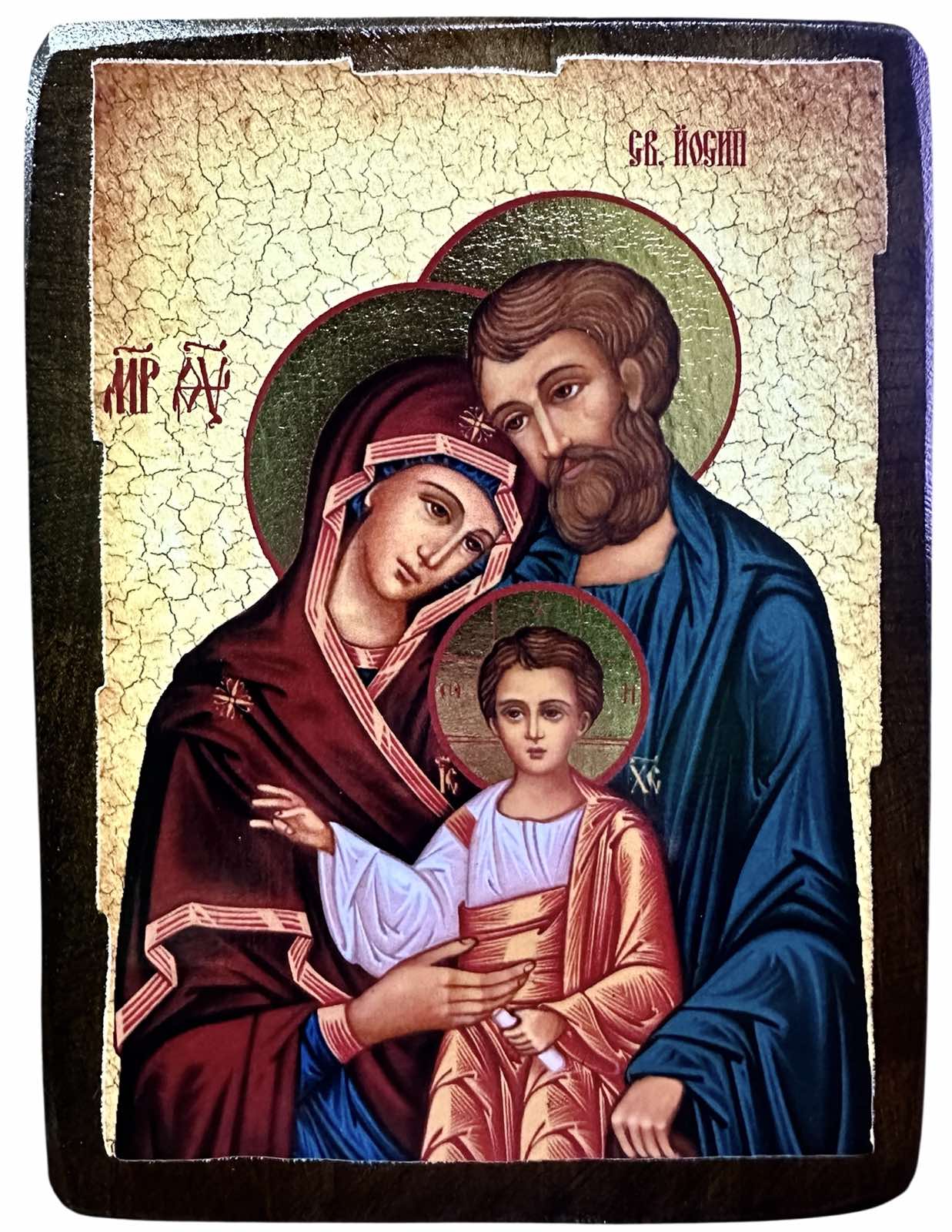 Икона ручной работы, искусственно сделанная под старину, материал: дерево, литография, краски, золочение, лаки. На оборотной стороне сургучная печать с символом Святой горы Афон. Упаковка конверт из мешковины.