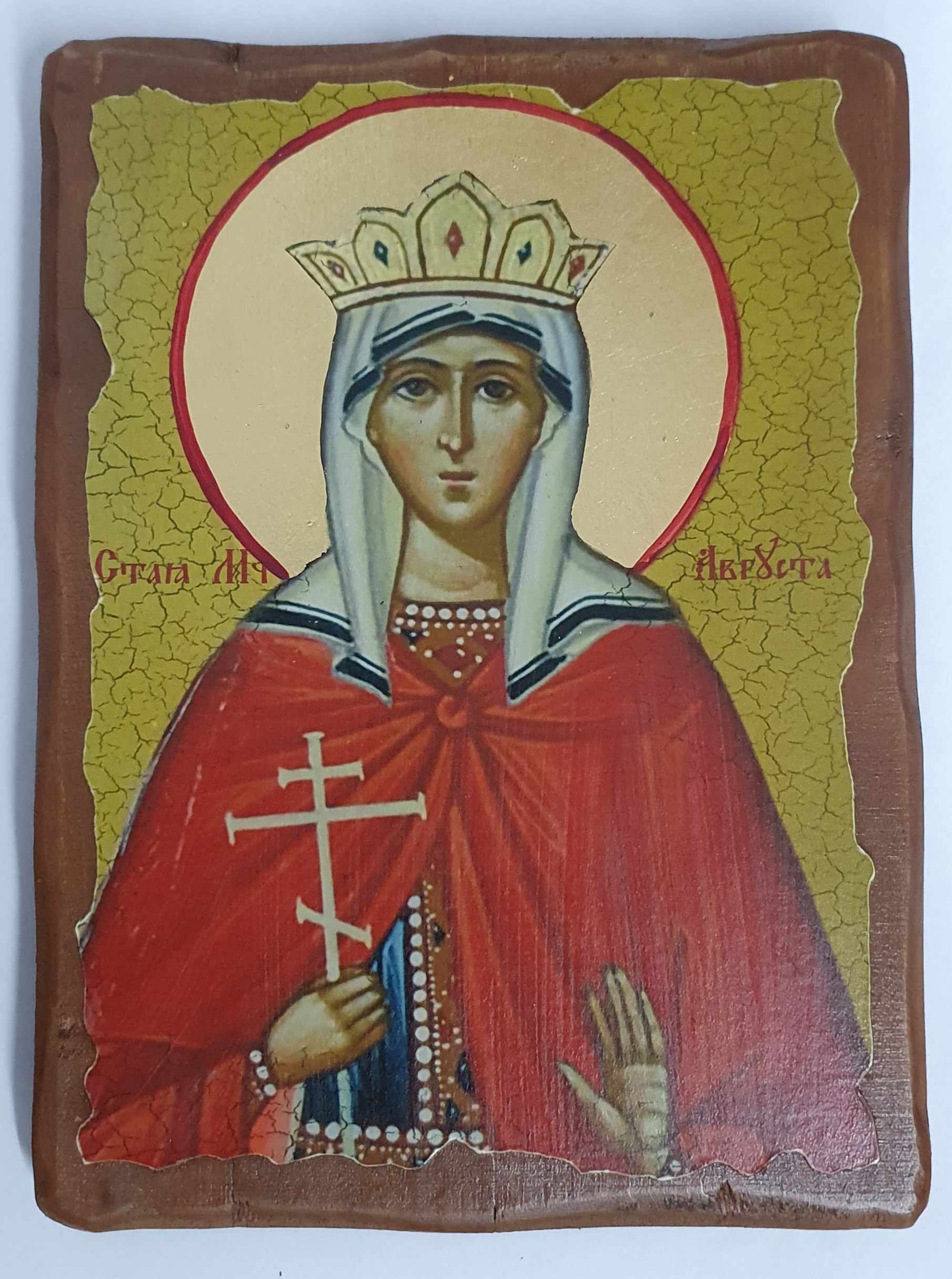 Икона ручной работы, искусственно сделанная под старину, материал: дерево, литография, краски, золочение, лаки. На оборотной стороне сургучная печать с символом Святой горы Афон. Упаковка конверт из мешковины.