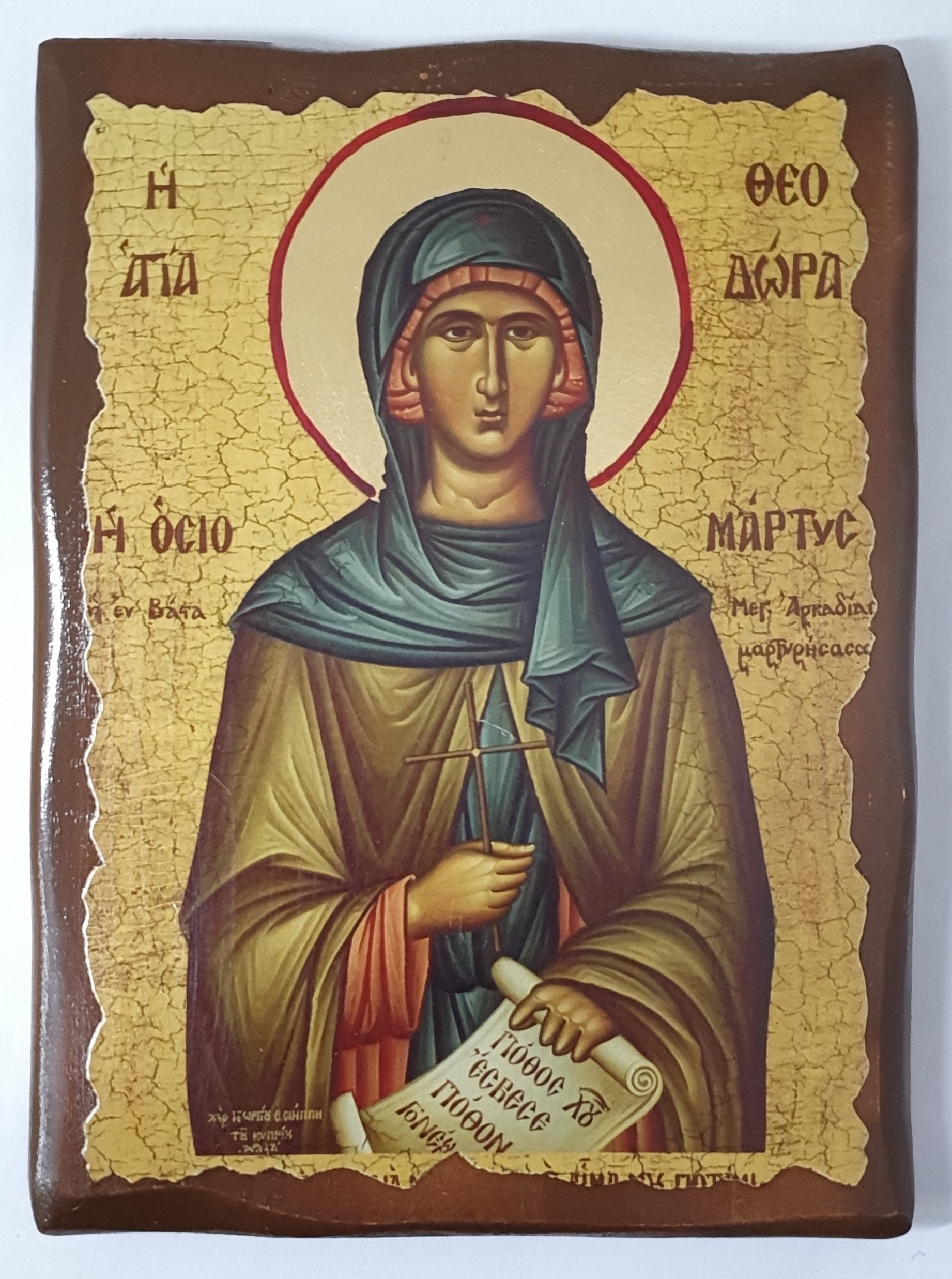 Икона ручной работы, искусственно сделанная под старину, материал: дерево, литография, краски, золочение, лаки. На оборотной стороне сургучная печать с символом Святой горы Афон. Упаковка конверт из мешковины.