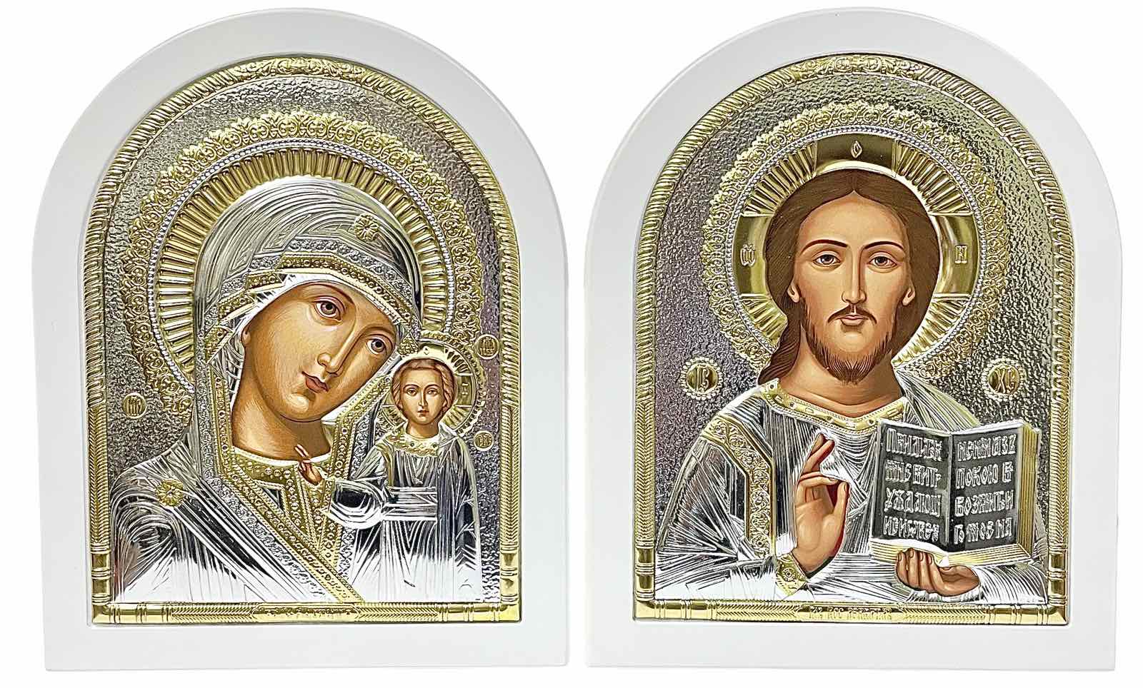Пара Вседержитель Казанська ↕24,5см ↔20,5см МДФ Шовкографія PVD(посріблення) Греція