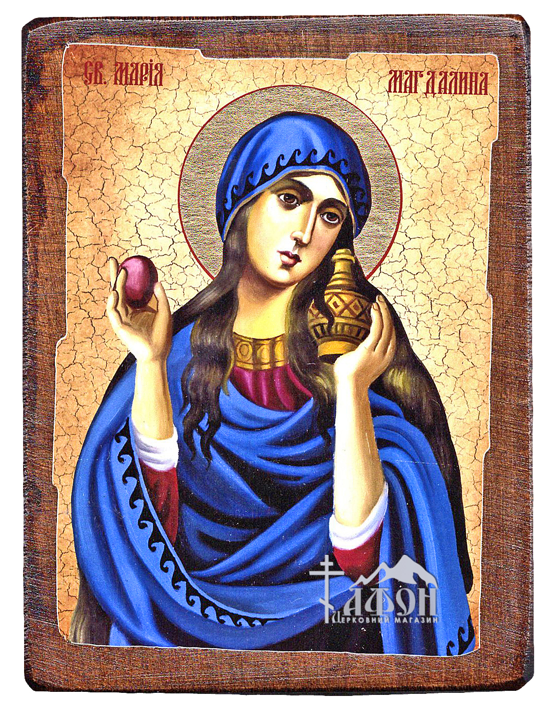 Мария Магдалина Размер 17/13см Икона ручной работы, искусственно сделанная под старину, материал: дерево, литография, краски, золочение, лаки. На оборотной стороне сургучная печать с символом Святой горы Афон. Упаковка конверт из мешковины.